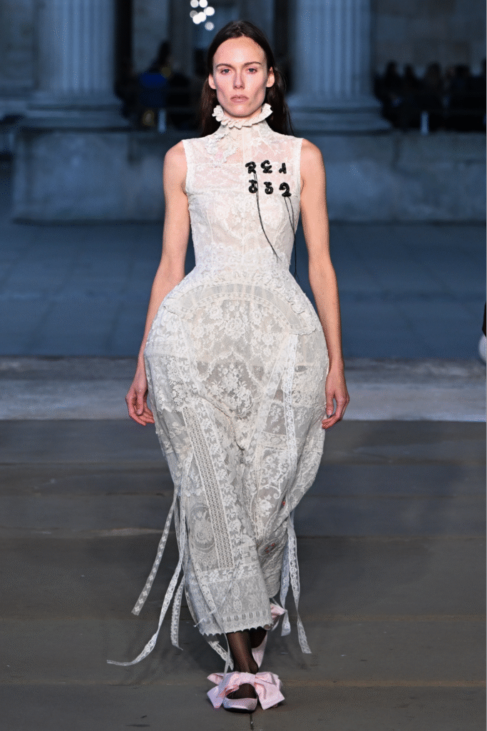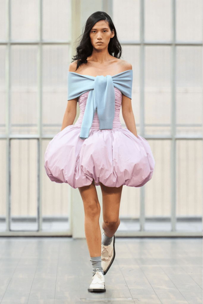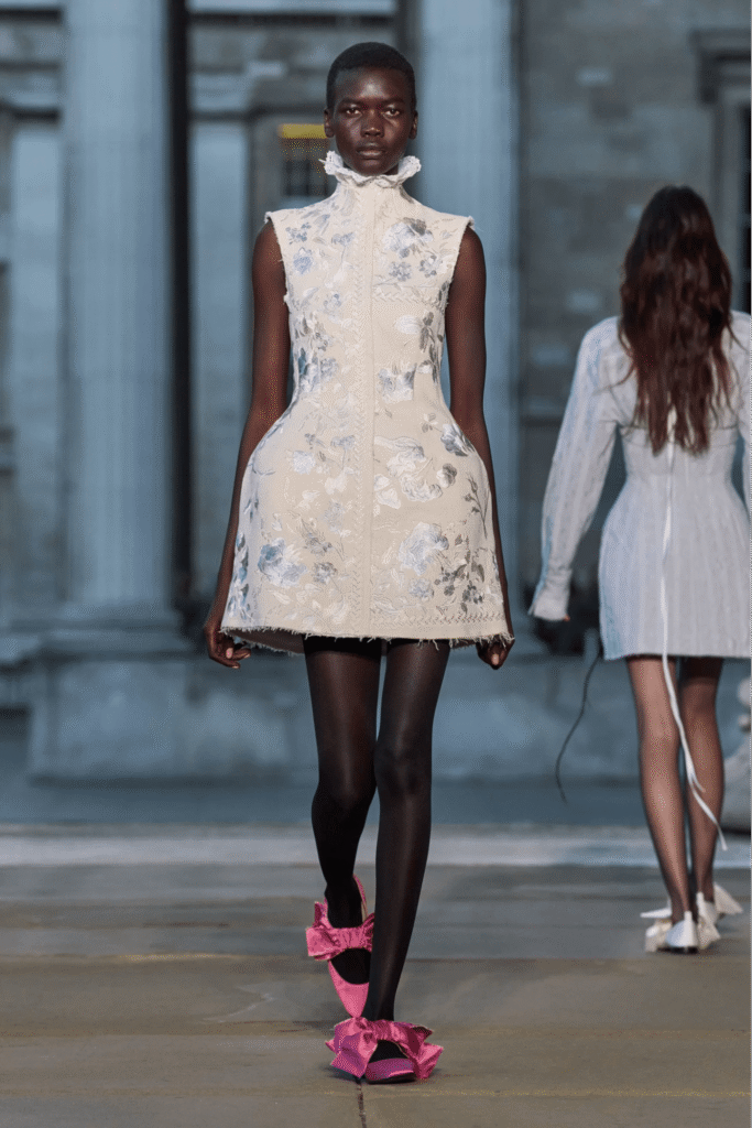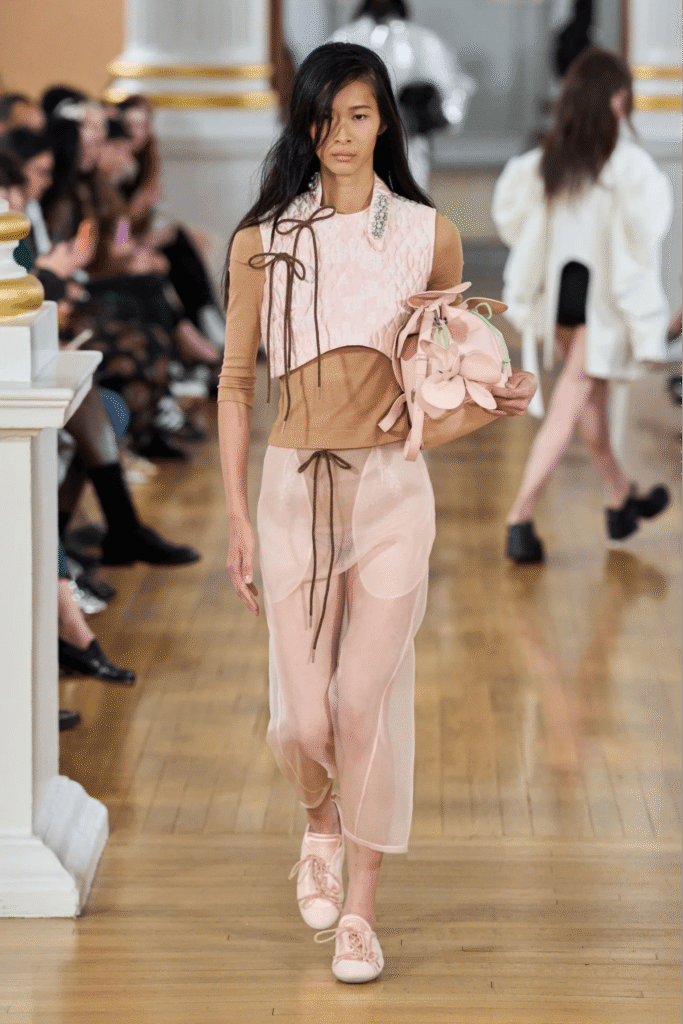 Os tecidos e estampas reforçaram a tradição da temporada de primavera e verão em dialogar com referências florais, mas de forma renovada e ousada. Rendas desconstruídas e sutis jogos de transparência surgiram como elementos recorrentes, muitas vezes combinados a aplicações tridimensionais de flores. Outra presença marcante foi o laço, revisitado em múltiplas escalas: dos modelos oversized, que ganharam destaque nos ombros de blusas e vestidos na Marques’Almeida, às versões delicadas exploradas por Simone Rocha e até os gigantescos que dominaram as sapatilhas Mary Jane da Erdem. Em termos de texturas, o crochê reafirmou sua força como ícone contemporâneo do artesanal, sendo utilizado e mesclado com rendas, tules e muita volumetria de tecidos.