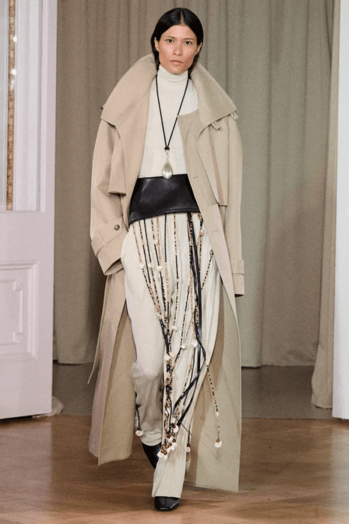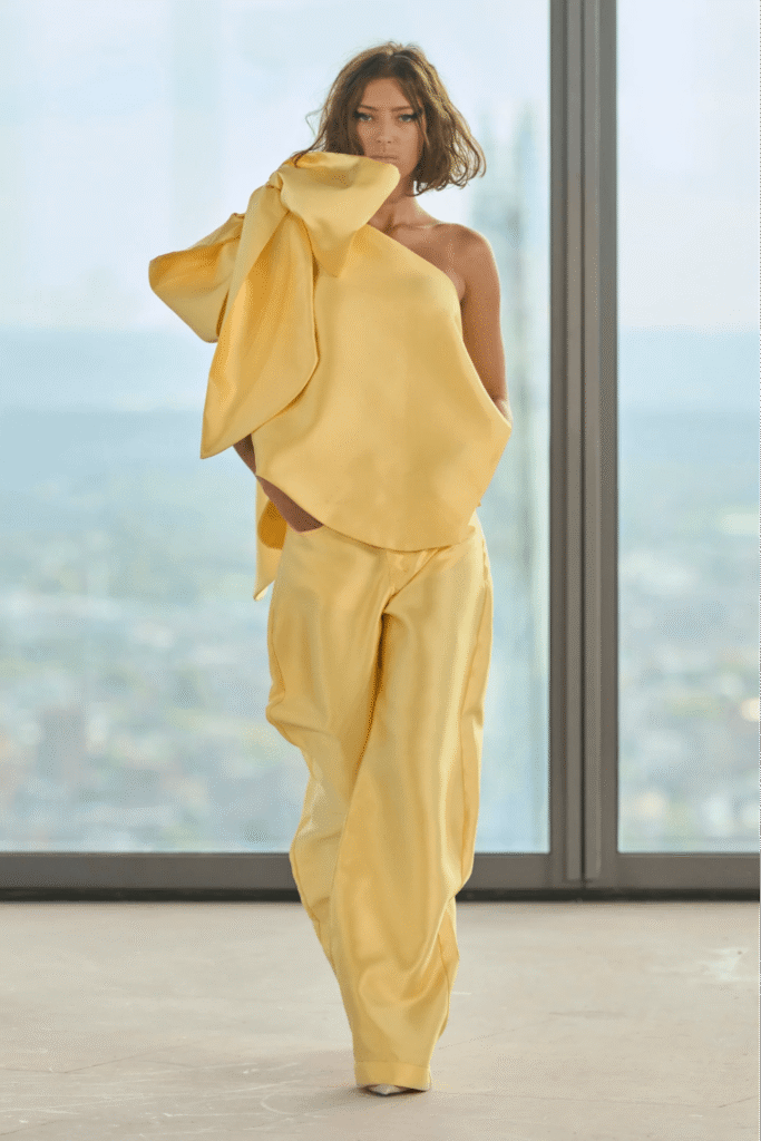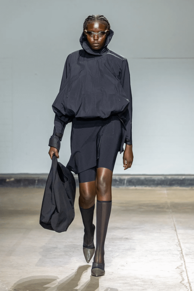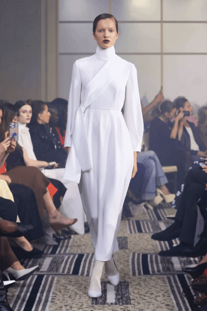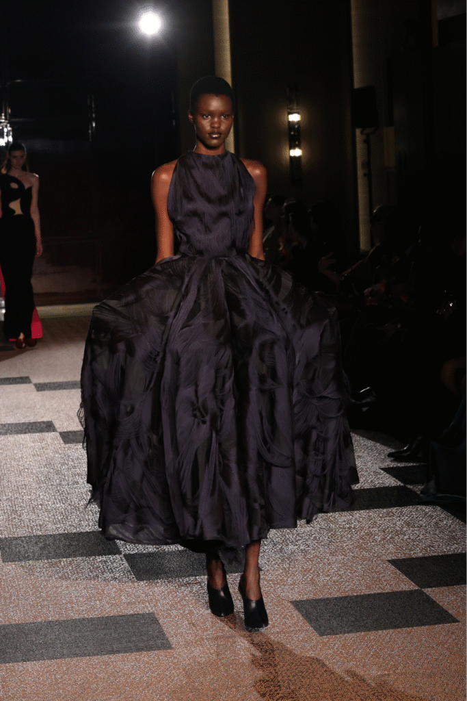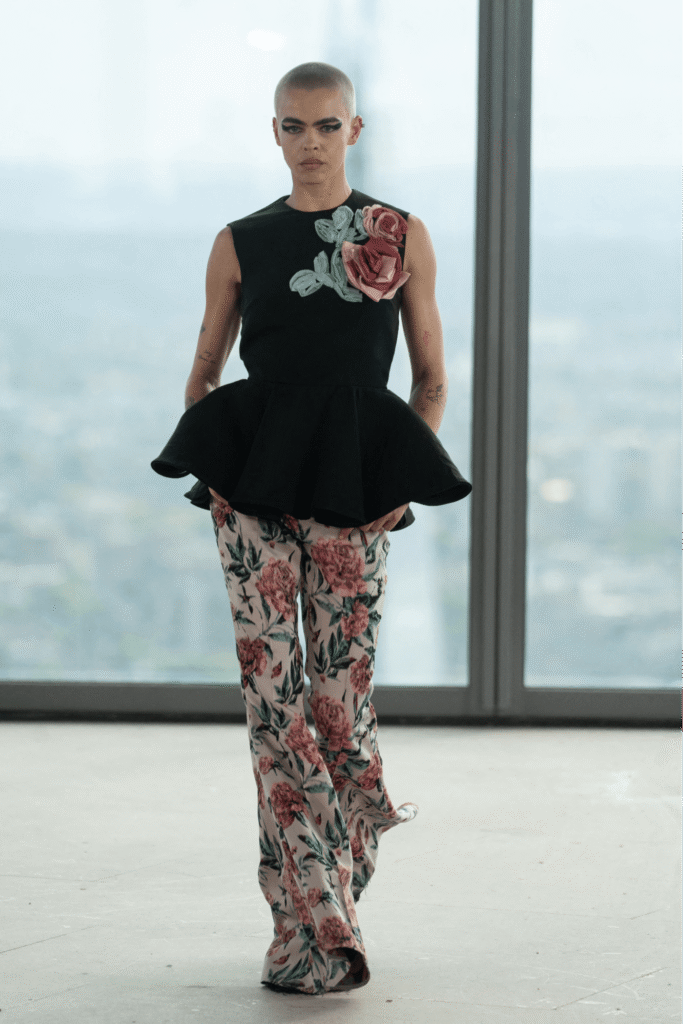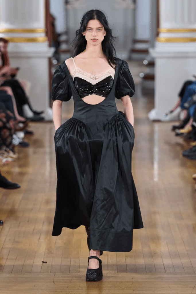 As silhuetas apresentadas na London Fashion Week reafirmaram a vocação da cidade para a teatralidade e a reinvenção histórica, transitando entre o mini e o longo, em propostas que equilibram ousadia e sofisticação. As cinturas marcadas surgiram como protagonistas, reforçadas por armações e estruturas internas posicionadas logo abaixo da linha da cintura, criando um contraste marcante entre o tronco ajustado em estilo corset e quadris volumosos. Essa retomada histórica materializou-se especialmente nas saias bufantes, que retornaram com força nas passarelas da Mithridate e da Keburia, inserindo um drama quase escultórico nas coleções. Outro detalhe recorrente foi a gola alta, elemento que já havia se destacado em Nova York e que, em Londres, foi reinterpretada de diferentes formas. O resultado foi um panorama que mesclou referências históricas e releituras contemporâneas.