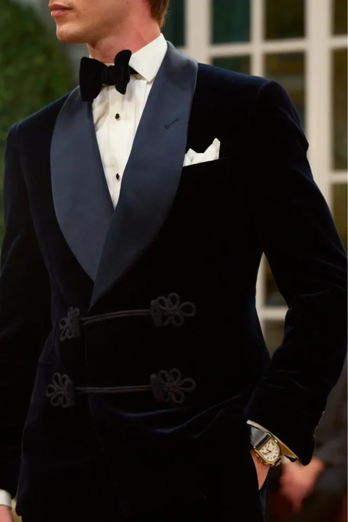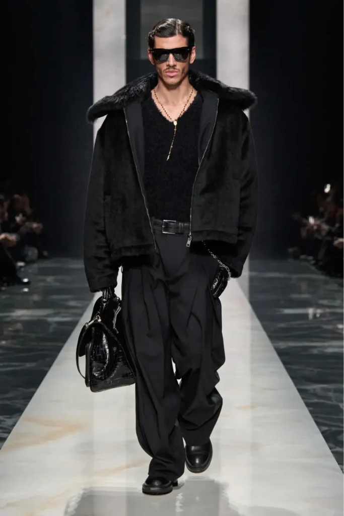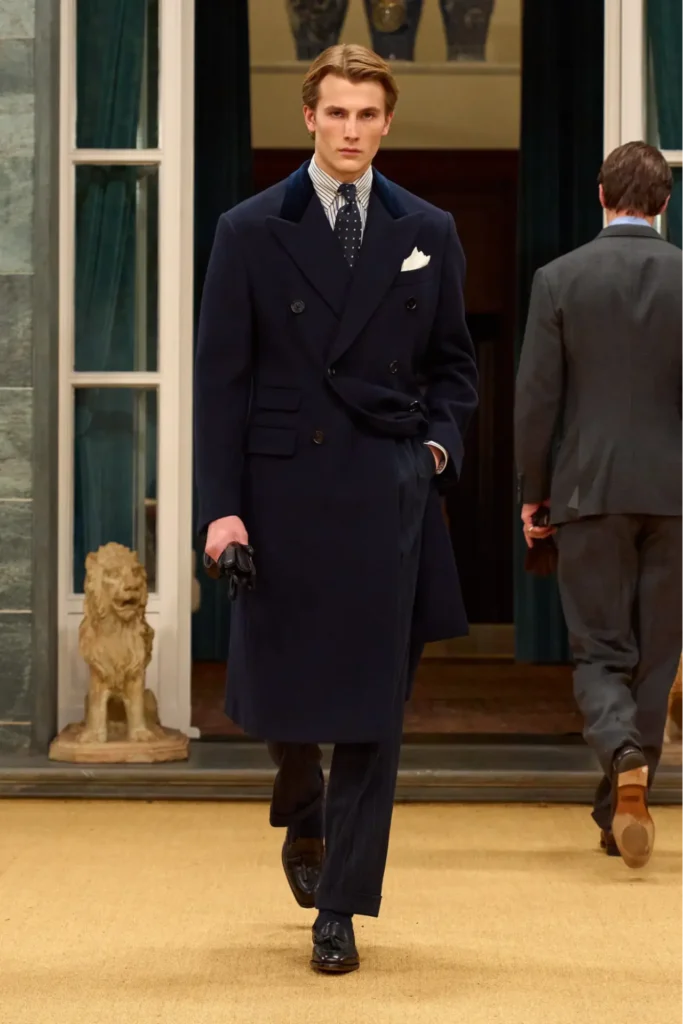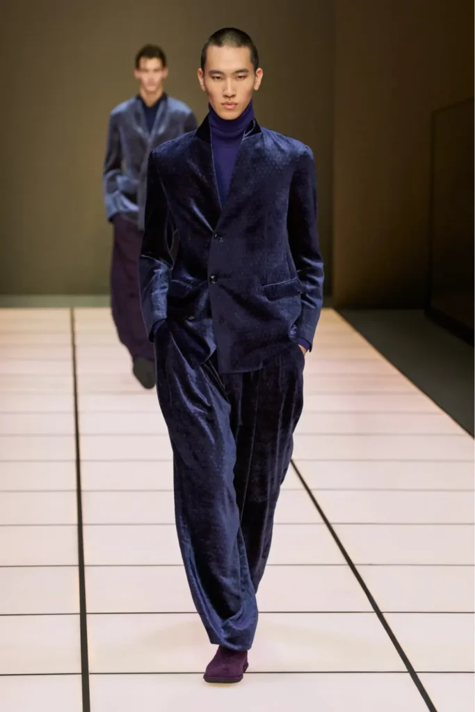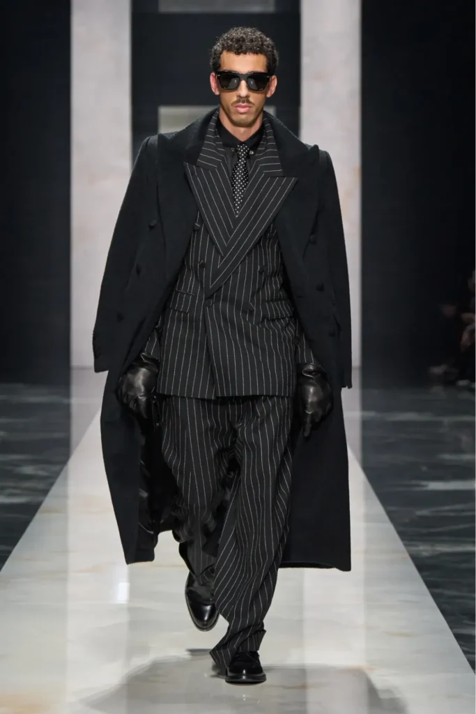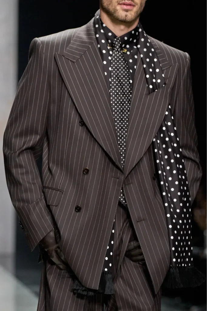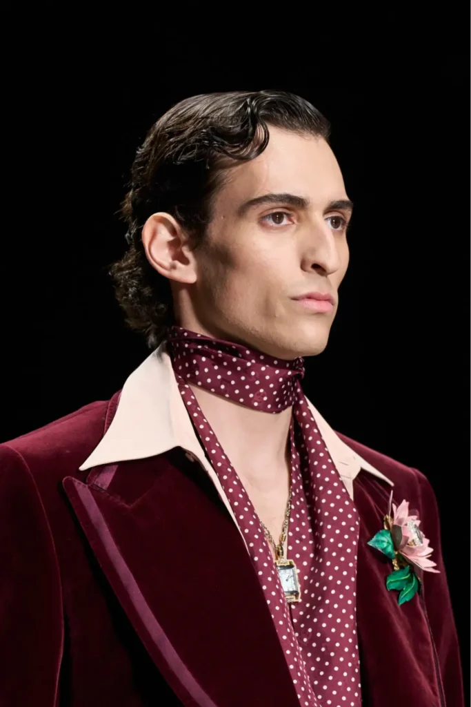 As superfícies ganham protagonismo na temporada, traduzindo uma moda masculina mais tátil, expressiva e menos literal. As estampas listradas surgem de forma abrangente, explorando variações horizontais e verticais, o poá retorna como elemento gráfico de impacto controlado e o mix de estampas surge como ferramenta de sofisticação visual. Paralelamente, os materiais reforçam uma busca sensorial evidente com o veludo e o bouclé em marcas de referência como Dolce & Gabbana, Ralph Lauren e Giorgio Armani. O denominador comum é a valorização de texturas que estimulam o toque e adicionam densidade às composições em camadas.