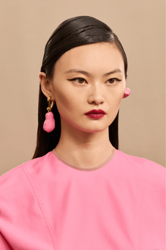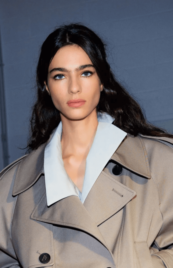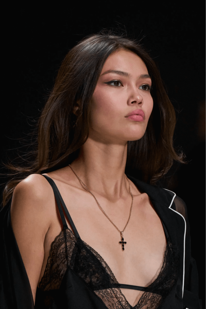 O delineador também voltou em versões atualizadas. Longe do traço esvoaçante que dominou temporadas anteriores, o que se viu nas passarelas foi um risco preciso e alongado. Dolce & Gabbana, por exemplo, apostou em uma pele impecável e radiante, finalizada com lábios bem definidos e um delineado felino que se estendia em direção às têmporas. Já nas coleções da Blumarine, The Attico e Durazzi, a proposta foi mais leve, com delineadores ultrafinos e levemente esfumados.